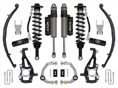ICON Vehicle Dynamics 2021-2024 Ford F-150 4WD suspension systems are designed with maximum performance and the serious driver in mind. ICON engineers? primary focus is to increase wheel travel and damping ability, which translates into outstanding vehicle control and ride quality both on and off-road. To achieve this, these systems include high-strength CNC machined ductile iron steering knuckles that replicate the suspension geometry of the F-150 Tremor and are effectively a Tremor ?conversion? for your F-150 4WD. This Stage 3 system includes vehicle-specific tuned 2.5? coilover shocks featuring remote reservoirs for exceptional cooling properties and ICON-engineered coil springs for superior vehicle ?feel? through the range of travel. These coilovers are also height adjustable for 3.5-4.5? of front lift over stock, allowing the use of larger, more aggressive wheel and tire combinations. Their combination with the ICON steering knuckles also allows for a 20% increase in wheel travel compared to other ICON F-150 coilover kits. Billet aluminum Delta Joint PRO upper control arms on the F-150 not only add strength and durability, but help retain factory alignment spec range, offer on-vehicle caster/camber adjustment, and allow for the extra lift height this system provides. ICON 2.5 Aluminum Series piggyback reservoir rear shocks utilize a vehicle-specific valving and offer increased damping and heat dissipation, balancing the performance of the truck from front to rear. ICON Multi-Rate Leaf Springs are included to allow rear spring rate and ride height customization, improve ride quality, and reduce axle wrap by eliminating the factory rear blocks. Rear ride height is kept within an acceptable range using the ICON billet aluminum 1" lowering shackles. The ICON Vehicle Dynamics 2021-2024 F-150 4WD Stage 3 suspension system is an excellent choice for those drivers looking to enhance the capabilities of their pickup on the road as well as in the dirt.