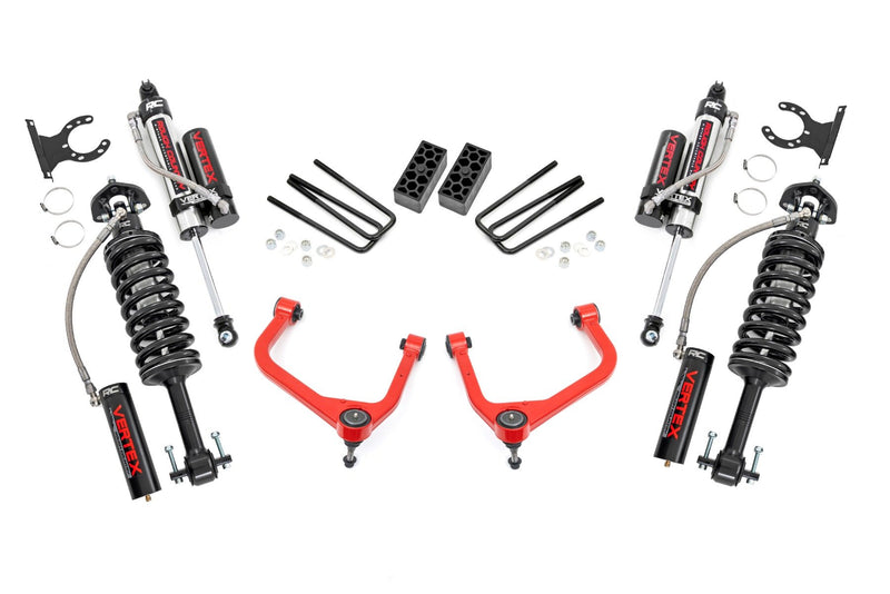 Levels Your Ride: Lifts and levels the front with the rear for a balanced stance.\ Optimized Lift: Provides a 3.5-inch front lift and 2.5-inch rear lift for enhanced clearance.\ Superior Ground Clearance: Conquer rough terrain with improved height and off-road capability.\ Premium Control Arms: Includes forged aluminum control arms for strength and durability.\ Enhanced Ball Joints: Features POM ball joints for a greater range of motion and smoother installation.\ Hassle-Free Setup: Pre-installed ball joints make installation quick and effortless.\ Fully Configurable with All Shock/Strut Options: Choose from our nitrogen-charged N3's to the premium Vertex reservoir for the perfect ride quality.