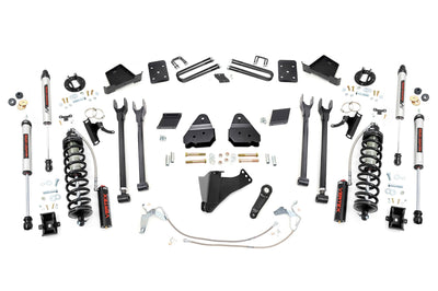 Superior Ride Quality. Give your third-generation Ford Super Duty an impressive upgrade and incredible ride quality with Rough CountryΓÇÖs 4-Link Coilover Conversion Lift Kit! This must-have kit is the pinnacle of suspension upgrades. Providing ride height adjustability, increased dampening, and killer good looks. You're sure to set yourself apart from the pack. This innovative kit allows you to replace your factory arms with a 4-Link setup, using Rough CountryΓÇÖs durable, fixed upper arms and adjustable lower control arms. A set of radius arm drop brackets maintain proper geometry and allow for proper caster setting, which is crucial to maintaining factory handling.\ Durable Components. Rough CountryΓÇÖs 6" 4-Link Coilover Conversion Lift Kit features top-mounted reservoir brackets and coil-over mounts constructed from 1/4-inch steel. Utilizing this conversion kit you're removing the factory independent coil shock and coil set-up and replacing it with a massive 2.5in piston, nitrogen-charged, 8-stage adjustable Vertex Coilover. Rough CountryΓÇÖs Vertex Coilovers feature a monotube design with an external reservoir for increased oil capacity and damping sensitivity. When it comes to investing in a high-end kit, youΓÇÖll be pleased to find that Rough CountryΓÇÖs 2.5in piston design is beefier and offers an impressive 56% greater fluid capacity than the average reservoir shock. Each kit is paired with a monotube shock that provides optimal damping control.\ Installation. Requiring cutting and drilling to install, an estimated timeframe of 6-10 hours is recommended to complete this full installation. This full kit can be installed at home and can be completed efficiently and quickly!\ Limited Lifetime Replacement Warranty. Rough CountryΓÇÖs 4-Link Coilover Conversion Lift Kit is backed with a limited lifetime replacement warranty towards manufacturer defects. As such, the product is protected from structural and workmanship damage after the date of purchase. With our industry-leading warranty give yourself peace of mind when using Rough Country's Suspension products!