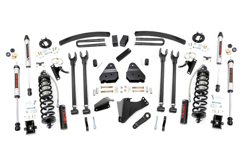 Superior Ride Quality. Give your first-generation Ford Super Duty an impressive upgrade and incredible ride quality with Rough CountryΓÇÖs 4-Link Coilover Conversion Lift Kit! This must-have kit is the pinnacle of suspension upgrades. Providing ride height adjustability, increased dampening, and killer good looks. You're sure to set yourself apart from the pack. This innovative kit allows you to replace your factory arms with a 4-Link setup, using Rough CountryΓÇÖs durable, fixed upper arms and adjustable lower control arms. A set of radius arm drop brackets maintain proper geometry and allow for proper caster setting, which is crucial to maintaining factory handling.\ Durable Components. Rough CountryΓÇÖs 6" 4-Link Coilover Conversion Lift Kit features top-mounted reservoir brackets and coil-over mounts constructed from 1/4-inch steel. Utilizing this conversion kit you're removing the factory independent coil shock and coil set-up and replacing it with a massive 2.5in piston, nitrogen-charged, 8-stage adjustable Vertex Coilover. Rough CountryΓÇÖs Vertex Coilovers feature a monotube design with an external reservoir for increased oil capacity and damping sensitivity. When it comes to investing in a high-end kit, youΓÇÖll be pleased to find that Rough CountryΓÇÖs 2.5in piston design is beefier and offers an impressive 56% greater fluid capacity than the average reservoir shock. Each kit is paired with a monotube shock that provides optimal damping control.\ Installation. Requiring cutting and drilling to install, an estimated timeframe of 6-10 hours is recommended to complete this full installation. This full kit can be installed at home and can be completed efficiently and quickly!\ Limited Lifetime Replacement Warranty. Rough CountryΓÇÖs 4-Link Coilover Conversion Lift Kit is backed with a limited lifetime replacement warranty towards manufacturer defects. As such, the product is protected from structural and workmanship damage after the date of purchase. With our industry-leading warranty give yourself peace of mind when using Rough Country's Suspension products!