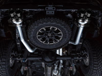 The 0FG is a dual 3” T304L stainless steel catback configuration featuring a bespoke H-pipe and AWE’s patented drone-canceling 180 Technology®. Together, combined with precision fitment, class-leading rigidity, and signature 4” slash cut tips, you’re looking at the Best Sounding Exhaust on the Planet™ for the Silverado ZR2 and Sierra AT4X. American-sourced T304L stainless steel with a wall thickness of .065” runs smoothly from front to back, connecting right after the factory emissions equipment. An H-pipe tailored specifically for the 6.2L is met shortly after to provide an aggressive and rich muscle tone with minimal rasp before filtering through the 180 Technology® resonators to destroy drone-prone frequencies while maintaining optimal performance. And for those looking to take their rig off the beaten path, AWE also offers the available BashGuard™, appropriately equipped with a .125” thick reinforced stainless ring, tucked up high out of the way of danger. Finishing things off on this kit are quad 4” double-walled, slash-cut tips, offered in chrome silver or diamond black, exiting under the rear bumper. AWE also made it easy to swap the rear portions of the 0FG to add the BashGuard (sold separately) at any time. This truly is the ultimate exhaust set up for any ZR2 or AT4X.