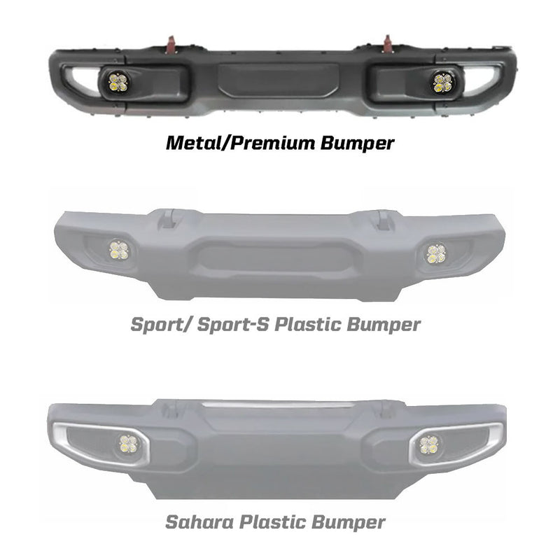 Baja Designs next generation Squadron® SAE fog pocket kit for the Jeep JL Wrangler/JT Gladiator is the perfect road-legal auxiliary fog light on the market today. Engineered with all-new aspheric projector optics and with our advanced LED technology provides a performance increase in luminous flux of 56% over our previous generation SAE model. The all-new Squadron® SAE delivers 2,420 lumens per light with output reaching up to 15,800 candela at just 29 watts. Keeping you safe on the road or trails, the Squadron® SAE will illuminate Zone 1 with a controlled, sharp cutoff from the combination of the new LED technology and highly efficient aspheric projector optics. Designed to meet the current SAE J583 fog lamp requirements, the Squadron® SAE is fully compliant with on-road regulations. This innovative approach allows for a highly controlled light pattern with a sharp cutoff, making them an ideal choice for driving through dust, fog, and inclement weather. Backed by our limited lifetime warranty and 30-day satisfaction guarantee, giving you the ultimate in-purchase protection. NOTE: This kit includes vehicle specific brackets for the following application: JL Rubicon/Gladiator w/ OE Rubicon Premium Bumper. USPTO Reg No. 5,766,659