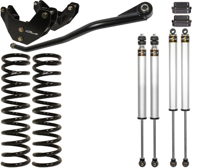 The Details: Your truck will sit 3”-3.5” higher in the front (cab configuration dependent) with 50% more suspension travel than the factory platform thanks to the taller, lighter rate coil springs. The rear is lifted 1”-2” via the customer’s choice of a Progressive Add-A-Pack or Full Progressive Leaf Pack. The Progressive Add-A-Pack maintains load capacity and replaces the factory overload with a 5-Leaf, progressive pack that changes the final rate of the spring pack keeping the rear planted while increasing traction and predictability. The optional Full Progressive Leaf Pack replaces the entire factory leaf spring assembly increasing travel and drastically increasing comfort (when compared to when compared to the factory springs or add-a-pack) throughout the entire usable travel stroke reducing payload to a “light” 3/4-ton spec. This can be brought back to factory capacity with the use of Carli Long Travel Airbags to achieve the best ride and adjustable rear load capacity!