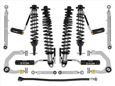 The ICON Vehicle Dynamics Stage 7 Suspension System for the 2021-UP Ford Bronco features our precision-manufactured, custom valved remote reservoir coilover shocks with CDCV to yield the maximum travel possible along with superior ride quality and suspension performance both on and off-road. These coilovers also allow for the adjustment of ride height to yield 2-3” of front lift and 1.25-2.25” of rear lift over stock 4-door Broncos with the Sasquatch Package. Remote reservoirs greatly increase shock oil volume and heat dissipation surface area to resist overheating and cavitation under hard use, which can lead to damper fade, ensuring sustained shock performance at speed through rough terrain. The included CDC Valves control fluid flow under compression, allowing you to achieve the perfect shock tune whether driving on the street, slow-crawling through the rocks or mobbing across the desert at full throttle. To accommodate the increased travel and lift height afforded by the ICON Coilovers, this Stage 7 kit comes with Billet Aluminum Upper Control Arms which provide on-vehicle caster and camber adjustability and feature our patented Delta Joint PRO, which allows for up to 90-degrees freedom of movement. Stage 7 also includes the complete billet rear link kit including upper links and ICON's tubular Adjustable Rear Track Bar. The added upper links have been designed for clearance from the fuel tank during maximum articulation and feature greaseless bushings, massive FK rod ends, and on-vehicle adjustability just like the lower links. The Adjustable Track Bar also features our dual-durometer greaseless bushing and an FK Rod End, as well as on-vehicle adjustability for perfectly aligning the Bronco's rear axle for any lift height. The rear shocks are oriented shaft-up with unique triple-rate coil springs to achieve the most rear suspension travel and the best ride quality possible.