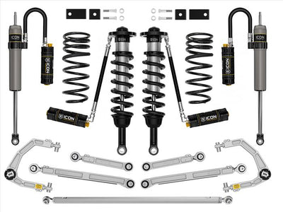 The ICON Vehicle Dynamics Stage 11 complete suspension system for the 2022-2023 Toyota Tundra builds upon the Stage 10 system with the addition of triple rate rear coils springs and an adjustable rear track bar. This system offers improved on- and off-road performance with adjustable compression damping, as well as improved alignment specs and increased front and rear-end lift height range for a proper stance and fitment of up to 35" tires. To compliment the rear coils and track bar, a 2.5 Series CDCV remote reservoir front coilover shock and billet aluminum front upper control arm combo is included along with a front sway bar drop kit and 2.5 Aluminum Series CDCV rear remote reservoir shocks with billet upper and lower rear links.