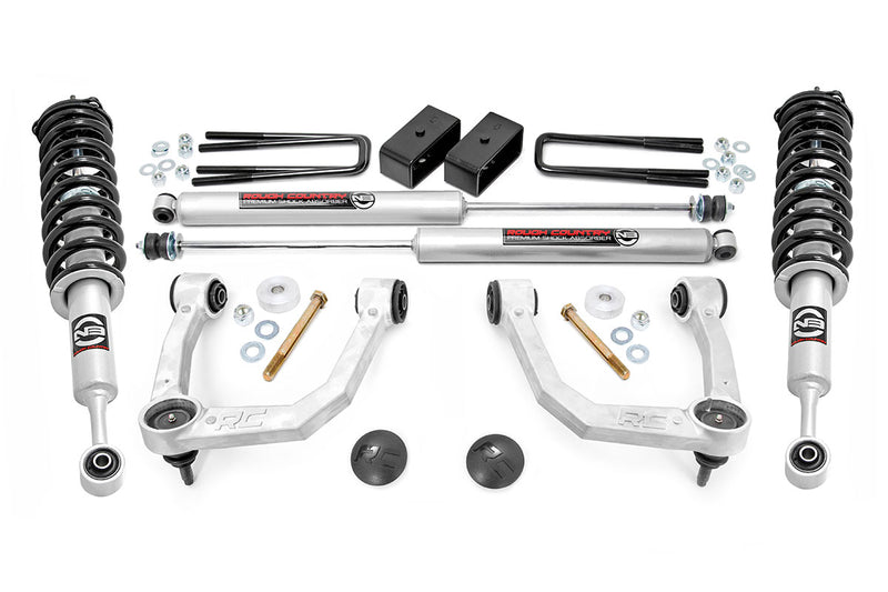 These arms are designed to promote a factory-like geometry by keeping the ball joint at optimum angles after lifting. This design allows for an improved, greater range of motion from the ball-joint, with less stress, wear and tear. Rough Countrys 3.5-inch Bolt-On Kit features N3 Nitrogen-charged shocks, giving your truck incredible ride-quality both on and off-road.