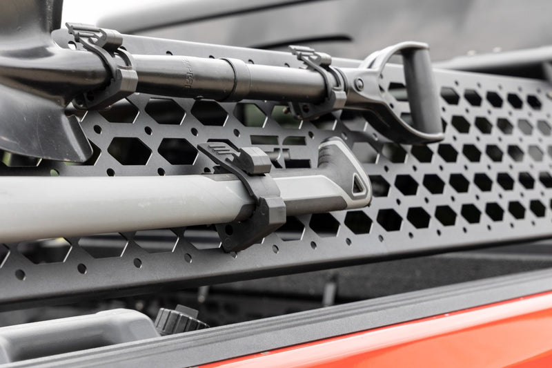 One clamp per package.\ Holds tools and equipment from 1 3/4" to 2 1/2" diameter.\ Each clamp supports a safe working load of 50lbs.\ Mounts with two 6mm bolts.\ Mounting area 1" x 3 1/2"\ Includes mounting hardware compatible with Rough Country Molle panel pattern and other Military panel patterns.\